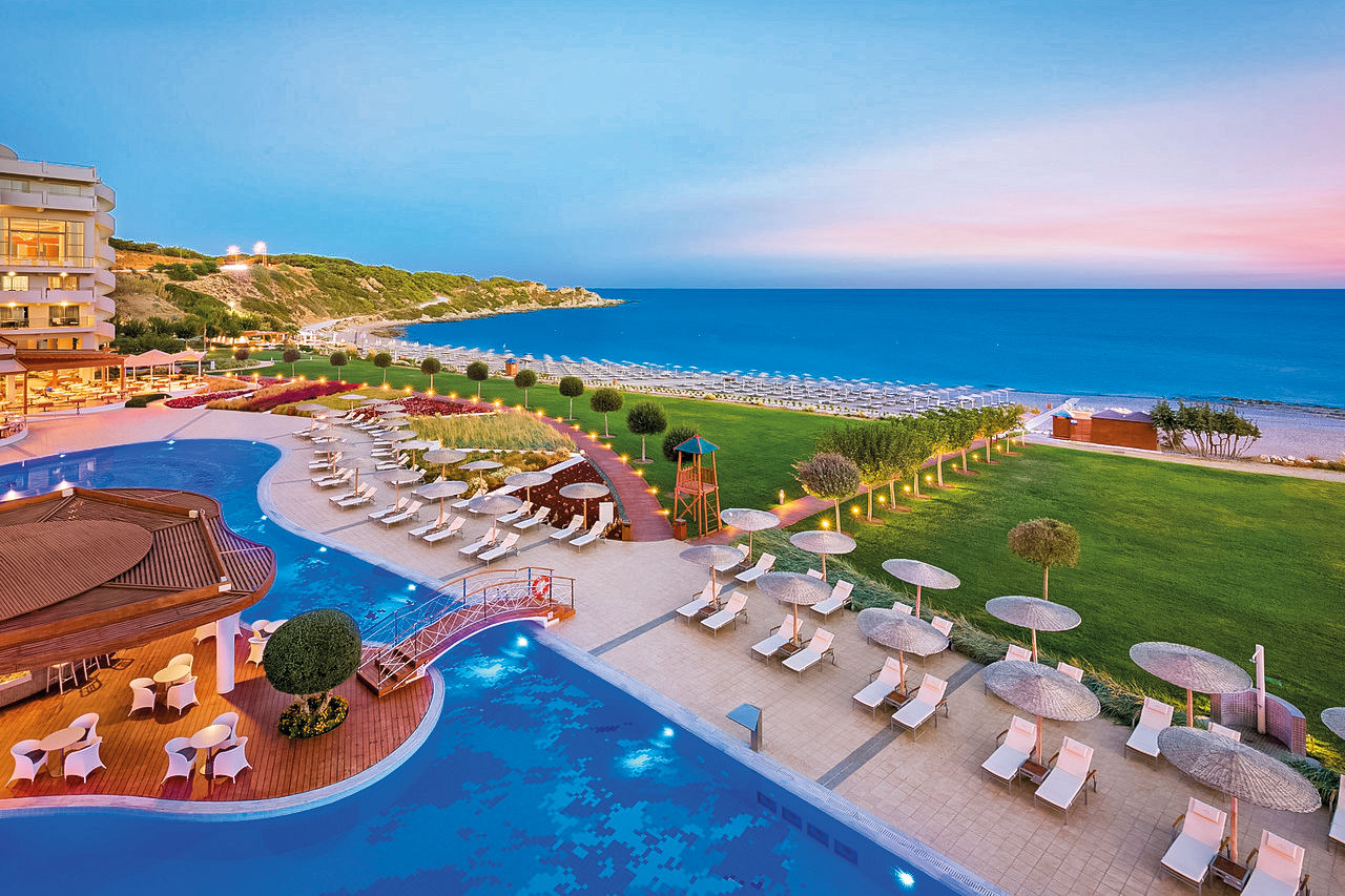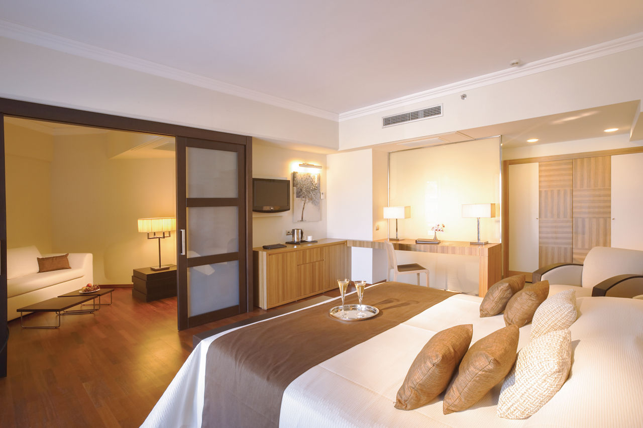 Experience true luxury as you step into the chic modern Elysium ResortDeluxe rooms with Sea View sleep up to 3 adults and have a bathroom containing a bath with shower attachment, air conditioning, bathrobe and slippers, flat screen television, mini fridge and balcony or terrace. Superior Deluxe rooms with Sea View, Deluxe One Bedroom suites with Sea View, Elite rooms with Sea View, Elite Superior rooms with Sea View, Elite Junior suites with Sea View and Elite One Bedroom suites with Sea View are also available. Elite service is included when booking Elite rooms and includes use of a dedicated lounge bar, all day complimentary juices, refreshments, light snacks in the Elite lounge and a selection of newspapers. Elite rooms include a whirlpool bath.
