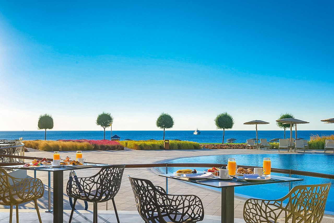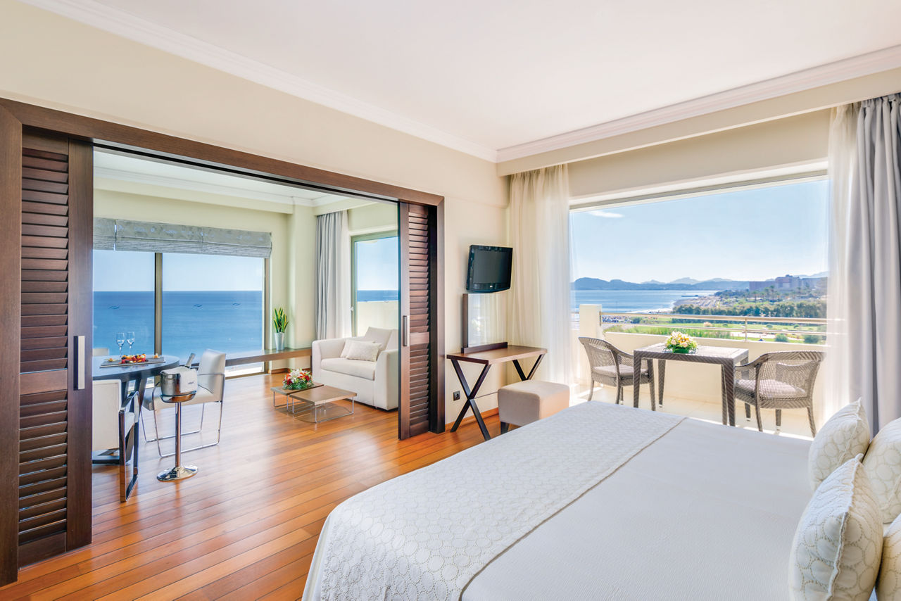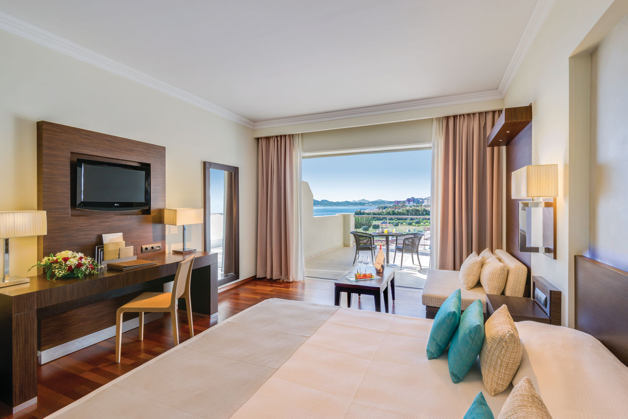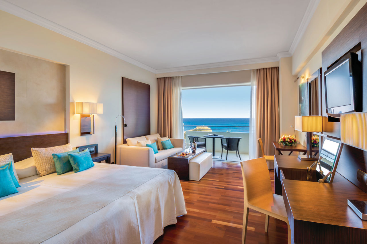 Deluxe rooms with Sea View sleep up to 3 adults and have a bathroom containing a bath with shower attachment, air conditioning, bathrobe and slippers, flat screen television, mini fridge and balcony or terrace. Superior Deluxe rooms with Sea View, Deluxe One Bedroom suites with Sea View, Elite rooms with Sea View, Elite Superior rooms with Sea View, Elite Junior suites with Sea View and Elite One Bedroom suites with Sea View are also available. Elite service is included when booking Elite rooms and includes use of a dedicated lounge bar, all day complimentary juices, refreshments, light snacks in the Elite lounge and a selection of newspapers. Elite rooms include a whirlpool bath.