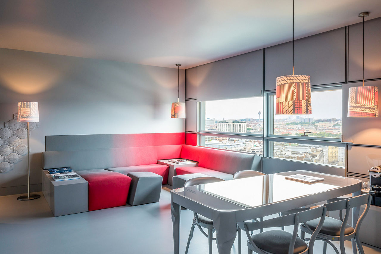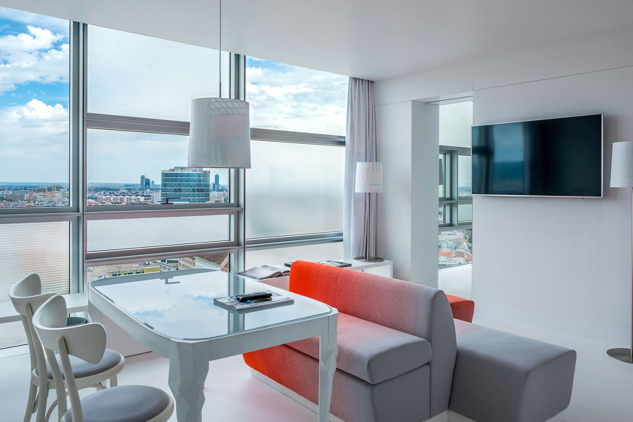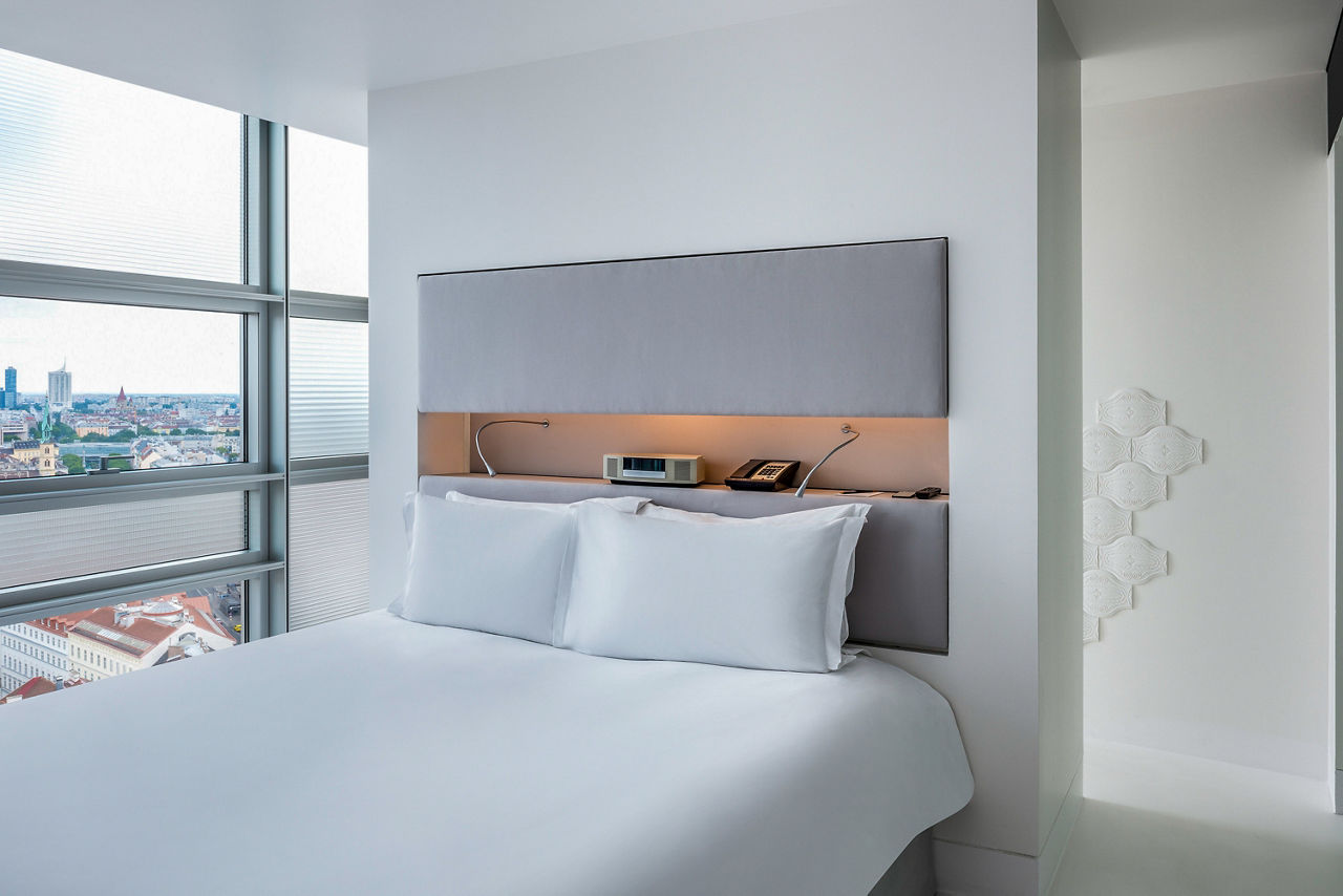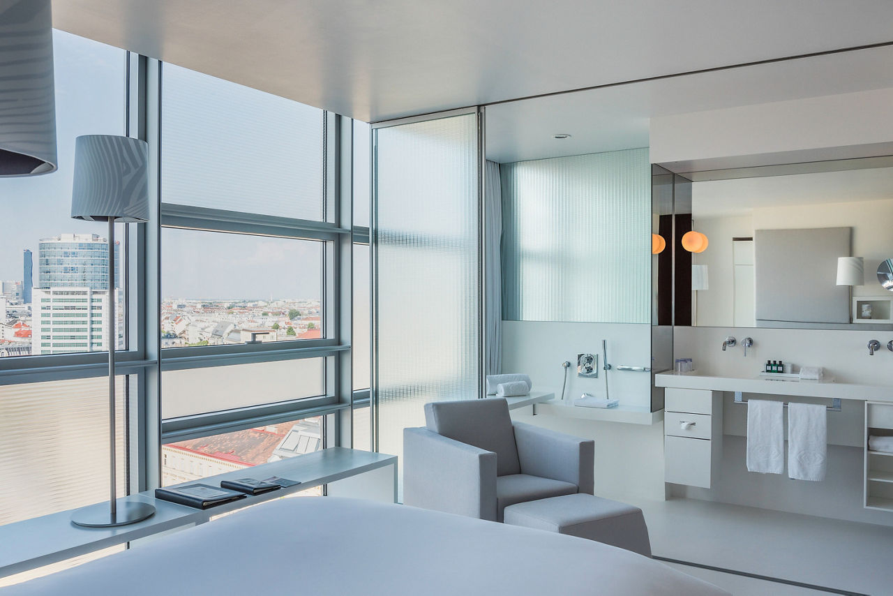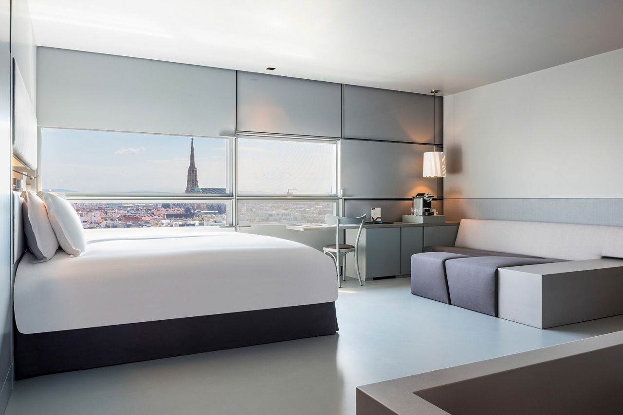 Rising magnificently from the vibrant rhythm of Austria's capital this 5-star superior luxury Vienna hotel makes a bold artistic statement. Inspired by the Gothic magnificence of St Stephens Cathedral, a short stroll away, renowned French architect Jean Nouvel has created a soaring sloping tower wrapped with glass and reflecting Vienna's historic skyline. Not just a luxury hotel in Vienna, but a living artwork. Set in monochrome walls of immaculate white, velvety black and cool grey vast windows explode with kaleidoscopic views of Vienna city life. Not least from the award winning restaurant Le LOFT whose dizzying panorama encompasses Viennas iconic monuments and museums. The Sofitel Vienna Stephansdom definitely has the wow factor!SO Comfy rooms sleep up to 2 adults and have a bathroom containing a bath and separate shower, air conditioning, hairdryer, bathrobe, safety deposit box, flat screen television, coffee maker and mini bar*. Room upgrade options are also available.