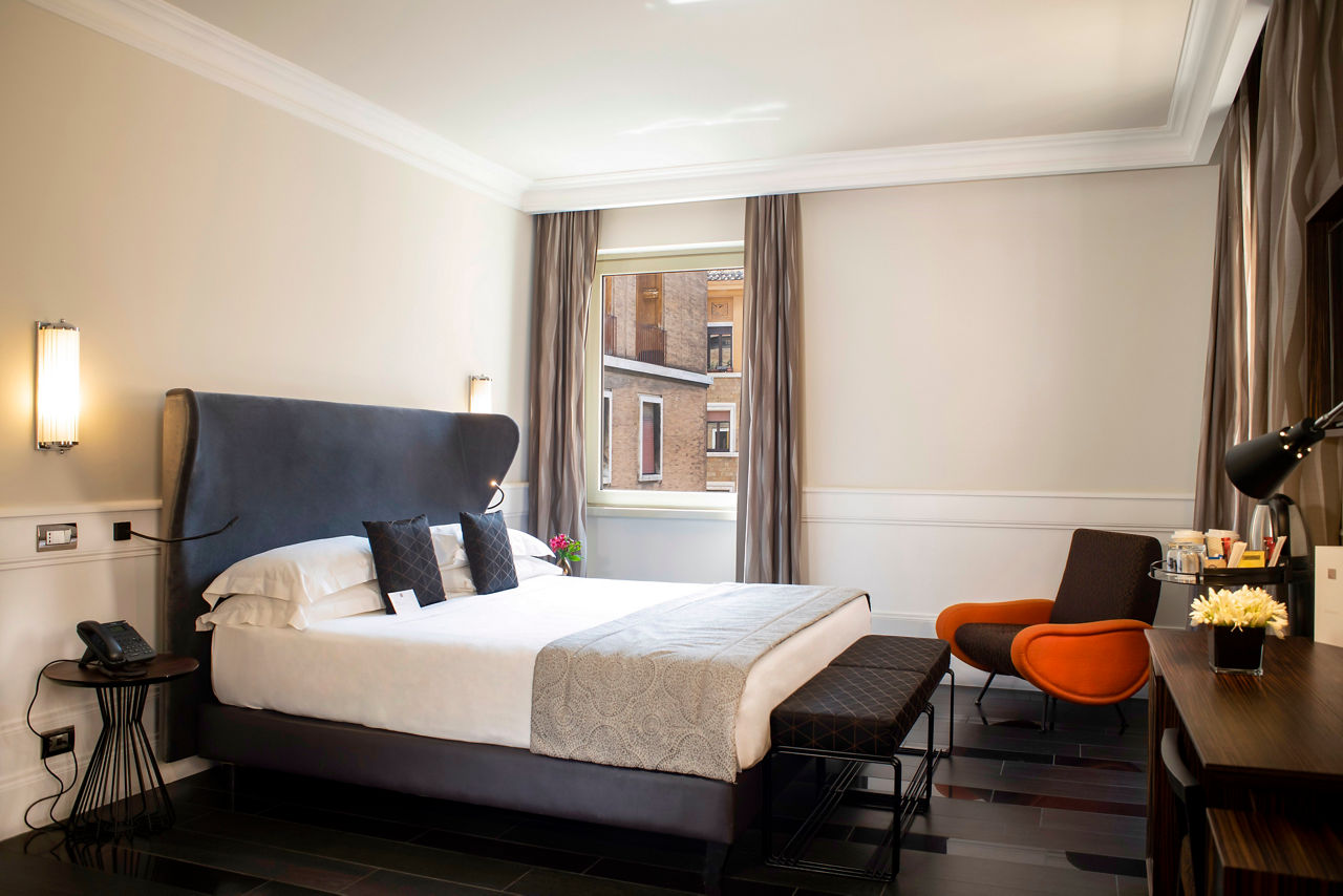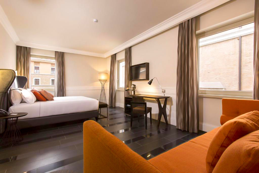 Close to the elegant Piazza Navona Square with fountains and bars, the Palazzo Navona combines a great central location with unique style. In this fantastic area near the Pantheon, you'll find many architectural treasures and charming piazzas, all within easy reach of the Trevi Fountain and Vatican City. With a range of comfortable, contemporary rooms plus the picturesque views from its rooftop wine bar overlooking the historic churches and monuments - it's a perfect choice for couples and friends looking to make the most of your time in the Eternal City.Classic Double or twin rooms sleep up to 2 adults and have bathroom containing a bath or shower, air conditioning, hairdryer, flat screen television, tea and coffee making facilities, mini-bar* and safety deposit box. Room upgrade options and Sole Use rooms are also available.