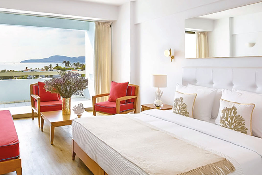 You?ll be enchanted within moments of stepping into this hotel. Sitting pretty on the beachfront, this spacious haven promises communal pockets of peace, a choice of colour-speckled rooms and All Inclusive Plus as standard. If the Greek architecture doesn?t dazzle enough, its two cooling outdoor pools by the sea will. Enjoy all the modern comforts of the complex. A full gym, an exciting daily entertainment line-up and a kids? club awaits. Prepare for palate-pleasing cuisine in all the restaurants too, where everything from Greek to Italian will be served. Who?s for a sundown tipple? The beach bar and lobby bar can help with that.Double and Twin rooms with Garden View sleeps up to 2 adults and have bathroom containing a bath with shower attachment, air conditioning, hairdryer, television and balcony or terrace.