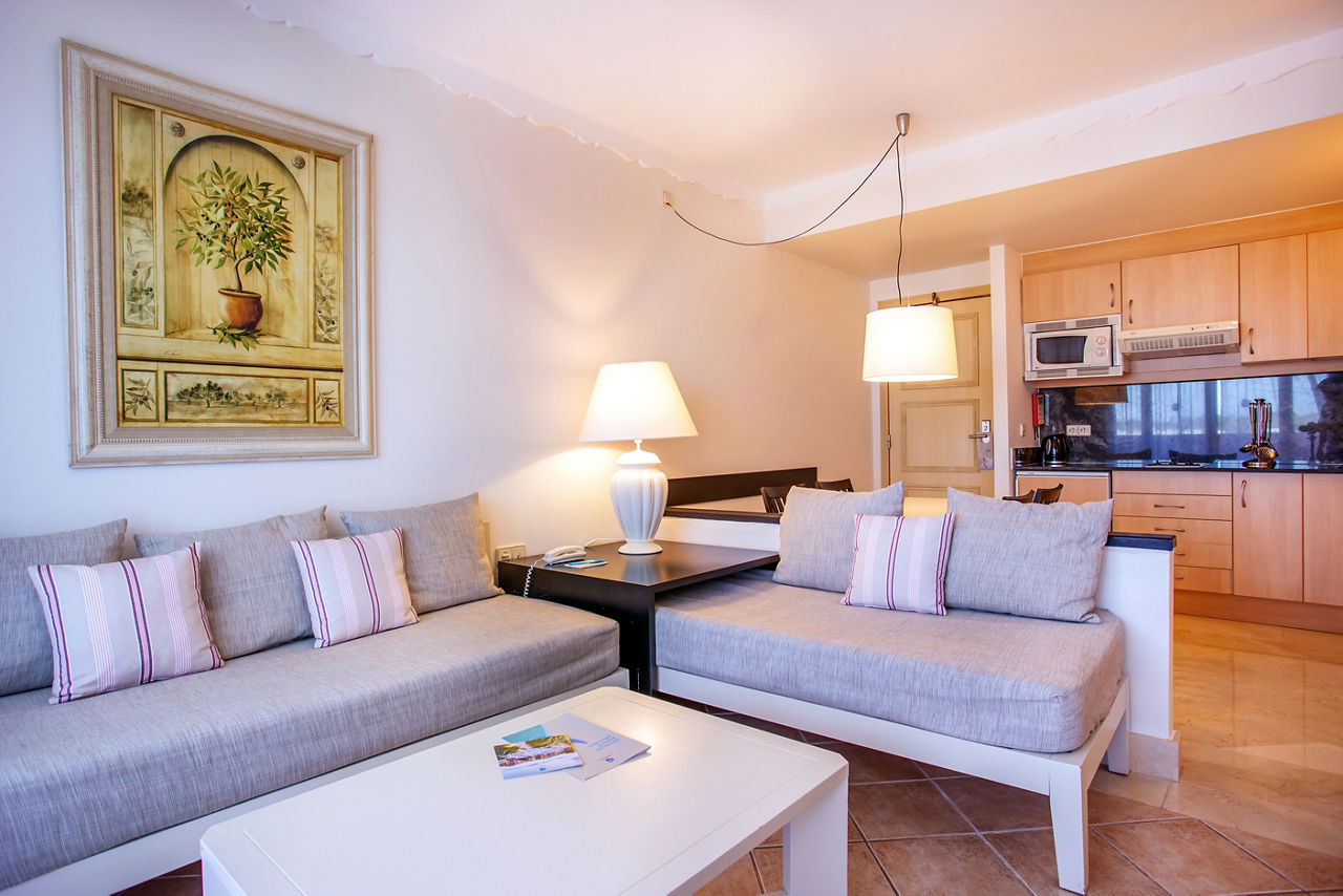 Grupotel Macarella SuitesStandard Suites sleeps up to 2 adults, and have a bathroom with bath, air conditioning, hairdryer, flat screen television, kitchenette and balcony. Room upgrades are also available.