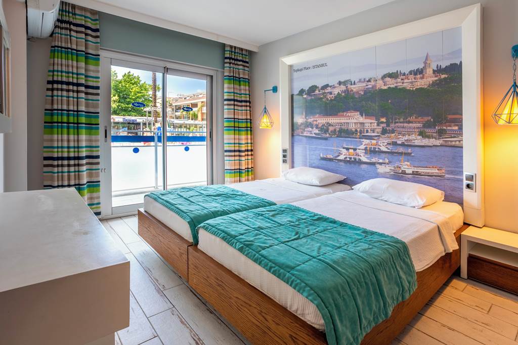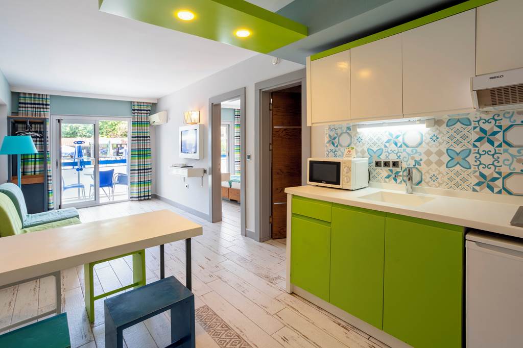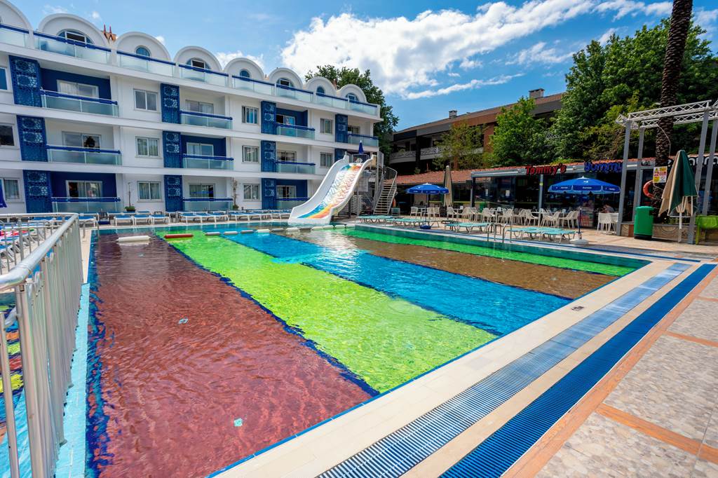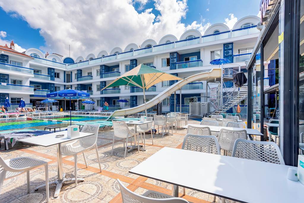 Offering guests a friendly atmosphere and bright, spacious accommodation, Exelsior Junior is a great choice for families and couples looking to explore the exciting resort of Marmaris. The poolside restaurant serves up delicious à la carte dinners and the pool bar will keep you refreshed during a day of soaking up the sun. Kids will love the pool with slide whilst guests can also venture next door and experience even more fun at Club Exelsior!One bedroom apartments sleep up to 4 adults or 3 adults and 1 child and have bathroom containing a bath or shower, hairdryer, flat screen television, kitchenette with 2 cooking rings, fridge, kettle, toaster, microwave and balcony.