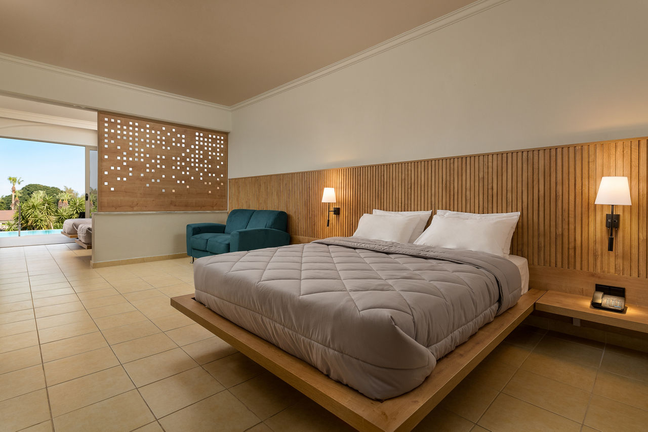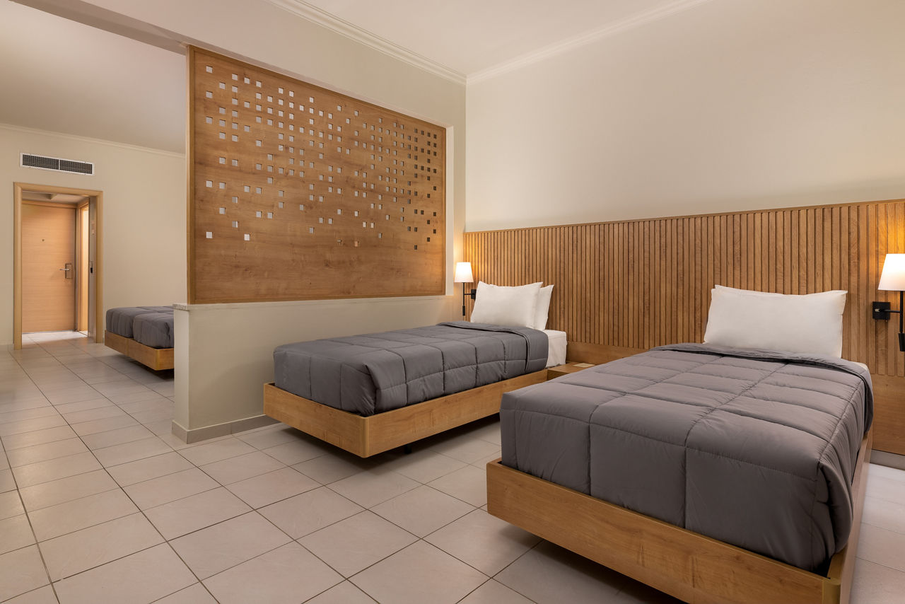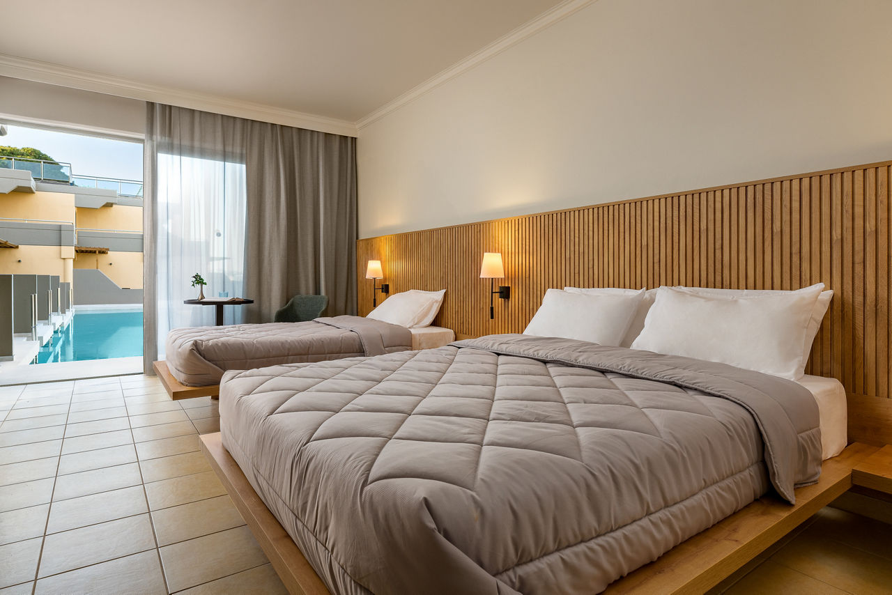 Double and Twin rooms sleep up to 3 adults or 2 adults and 1 child and have a bathroom with shower over bath, air-conditioning (01 Jun - 30 Sep), satellite TV, hairdryer and balcony or terrace. Garden view, Sea view and Family rooms are also available at a supplement.